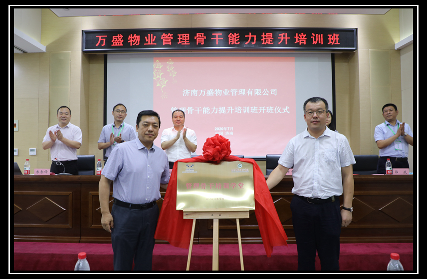 隨后,集團(tuán)公司副總經(jīng)理、地產(chǎn)公司總經(jīng)理徐洪濤和山青學(xué)院對(duì)外合作辦公室主任牟晉京共同為濟(jì)南萬(wàn)盛物業(yè)管理骨干培訓(xùn)學(xué)堂揭牌。